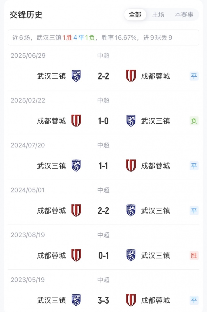 目前,武汉三镇1胜1平3负积负1分位列第14,蓉城5轮不败4胜1平积13分居榜首。