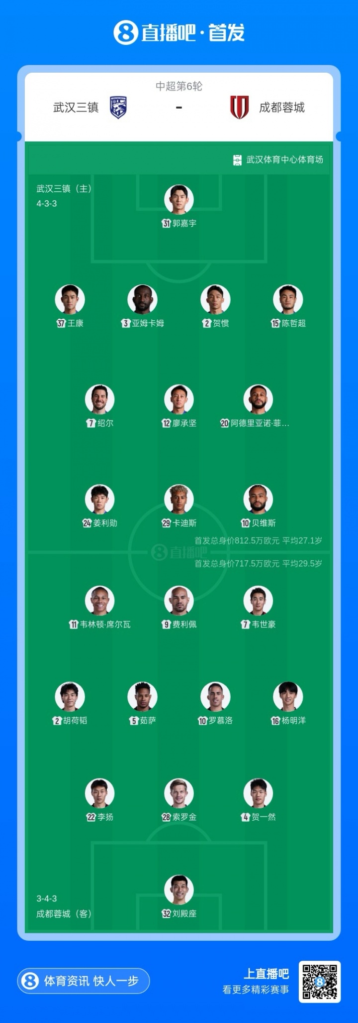 三镇vs蓉城首发:贝维斯先发,方镜淇替补,韦世豪、费利佩出战